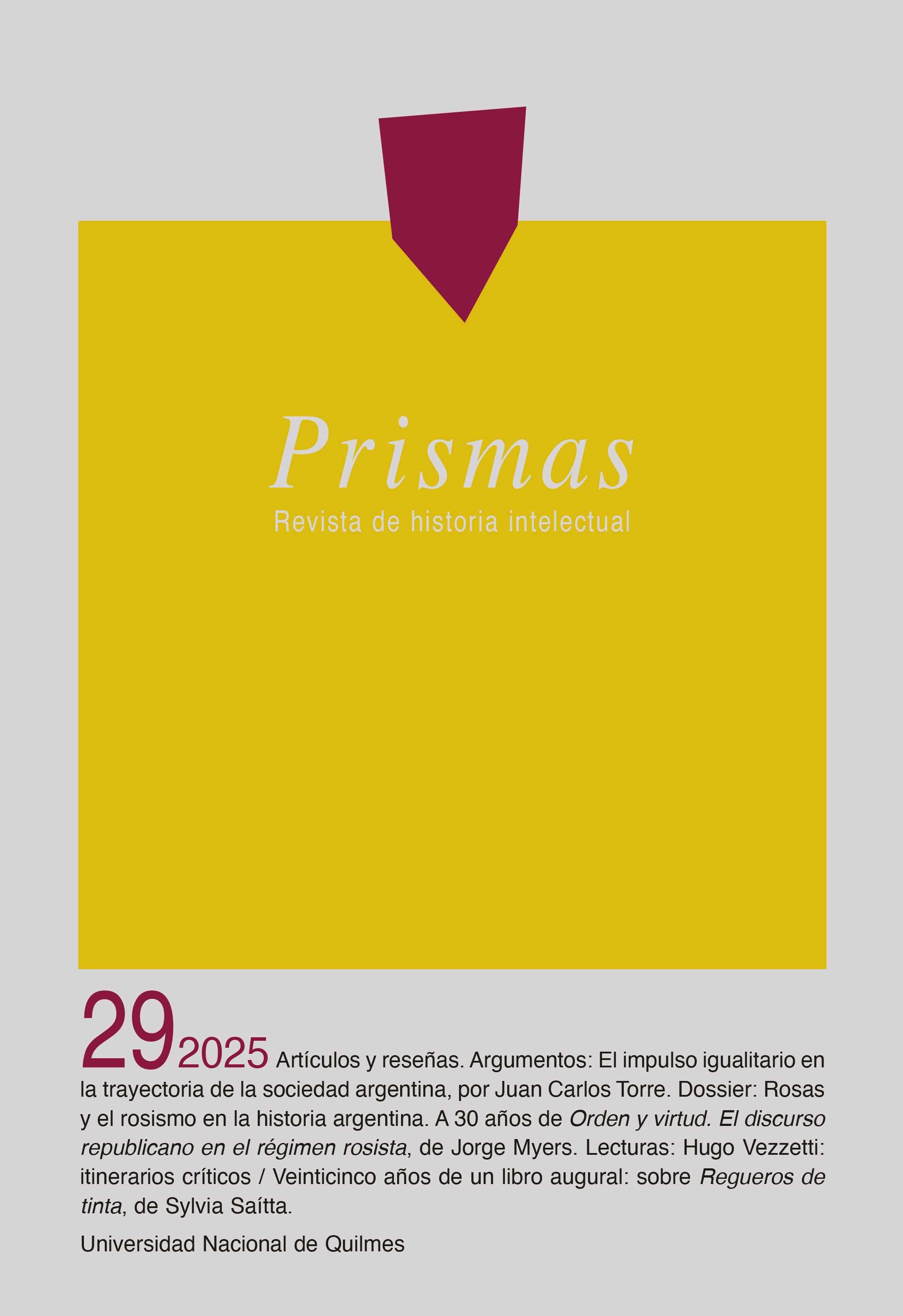 Argumentos: El impulso igualitario en la trayectoria de la sociedad argentina, por Juan Carlos Torre. Dossier: Rosas y el rosismo en la historia argentina. A 30 años de Orden y virtud. El discurso republicano en el régimen rosista, de Jorge Myers. Lecturas: Hugo Vezzetti: itinerarios críticos / Veinticinco años de un libro augural: sobre Regueros de tinta, de Sylvia Saítta. Obituarios. |
