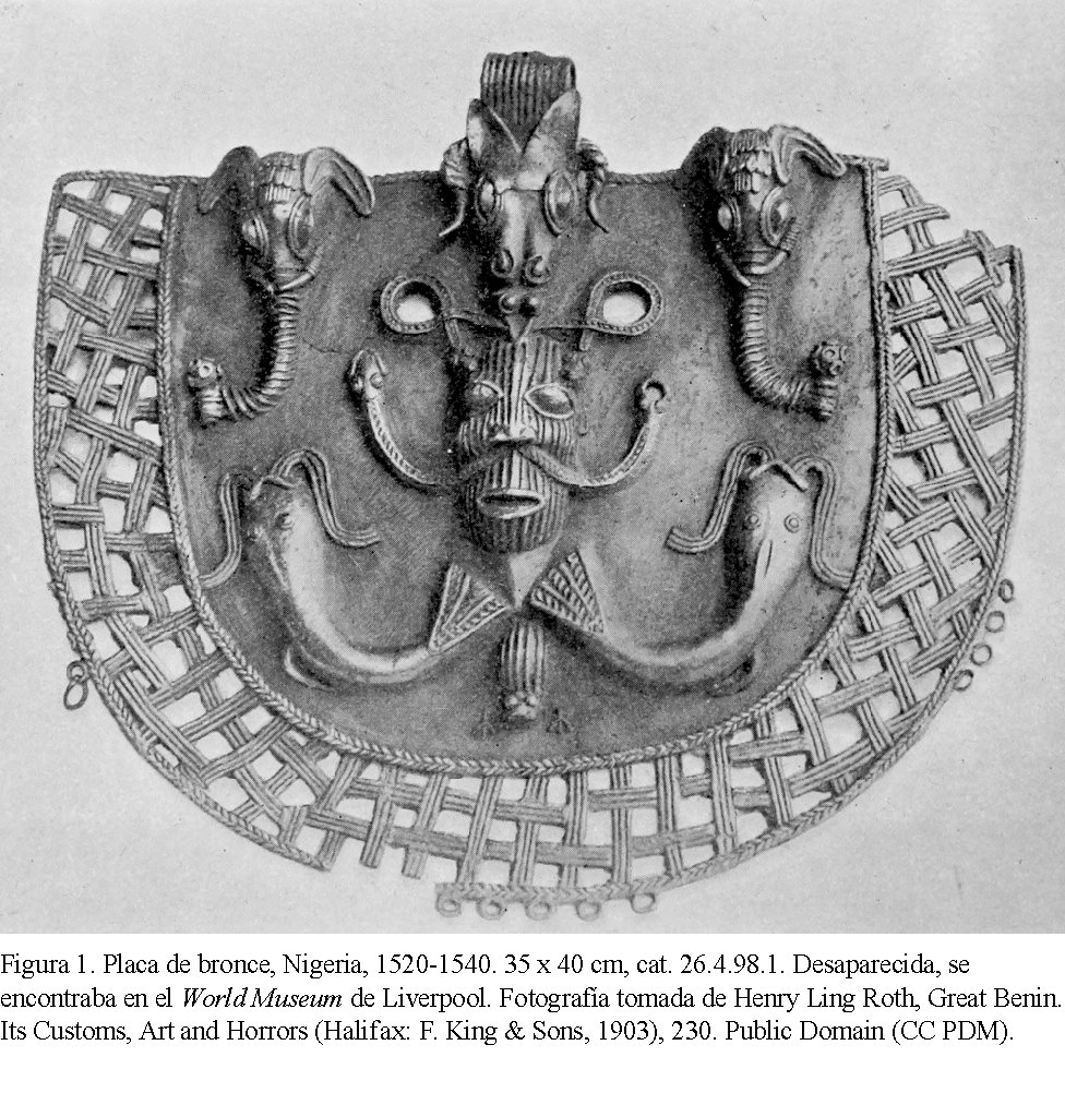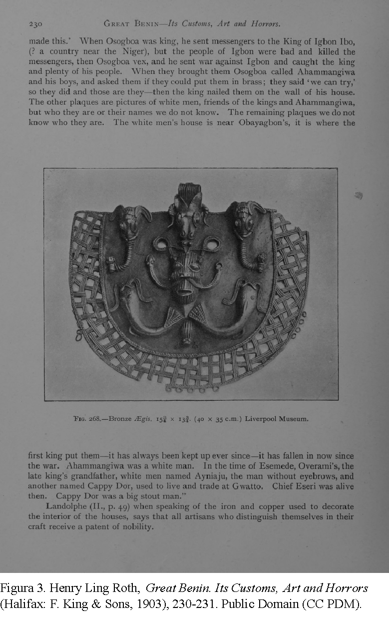 El segundo motivo por el que abordar este objeto significa evocar una ausencia –y gracias al cual contamos con evidencias que permiten justamente ese abordaje– es su origen. El único rastro visual superviviente de la pieza evoca una historia de violencia. Se trata de una fotografía, reproducida en Great Benin. Its Customs, Art, and Horror, libro publicado en 1903 por Henry Ling Roth, quien había vendido el pendiente al World Museum en 1898 (figura 3).[3] Henry Ling era hermano de Felix Roth, cirujano de la guardia avanzada de las fuerzas británicas que atacaron y saquearon Benín en febrero de 1897.[4] Si toda exhibición de un objeto ritual en un museo implica, hasta cierto punto, retirarlo de su contexto e insertarlo en otro universo de relaciones más o menos forzadas, en este caso la proveniencia devela un despojo detrás de ese ejercicio de descontextualización y recontextualización. Como veremos en el apartado siguiente, ese proceso violento que produjo la dispersión de los objetos aquí tratados erosionó también la posibilidad de que los benineses dieran cuenta de su propia historia: en tanto esas obras se integraban en altares ordenados simbólica y cronológicamente, la práctica mnemónica a cargo de especialistas en el recuerdo fue otra víctima del saqueo imperial.
