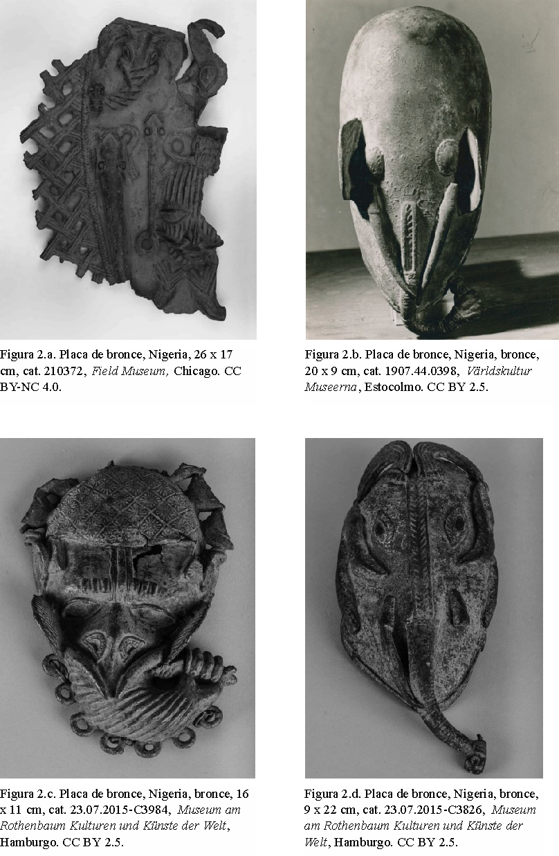 El punto de partida de este artículo es un bronce africano. Se trata de un pendiente decorativo y ceremonial, que exhibe algunos símbolos de autoridad característicos del reino de Benín: dos peces gato (probablemente el Malapterurus beninensis) y la rana; dos serpientes y dos cabezas de elefantes, cuyas trompas terminan en manos humanas (figura 1).[2] Sin embargo, analizar esta pieza significa referirse a la ausencia, en al menos dos sentidos.
