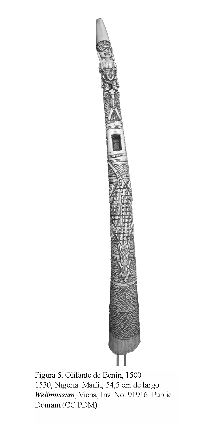 Tras la llegada de los europeos, los miembros de ambos gremios producían objetos tanto destinados al uso en la corte y en la sociedad local cuanto para la exportación, traficados por los portugueses primero y por los holandeses más tarde. Los objetos producidos para el uso local solían contener representaciones de elefantes, a los que se asignaba gran importancia, pues se consideraba que eran señores entre los animales, además de que solía definirse a los más importantes jefes humanos como elefantes.[20] En los colmillos tallados a partir del siglo xvii, los reyes aparecen montados sobre elefantes, no porque esa fuera una práctica usual sino porque significaba una afirmación metafórica de su poder (figura 5).[21]