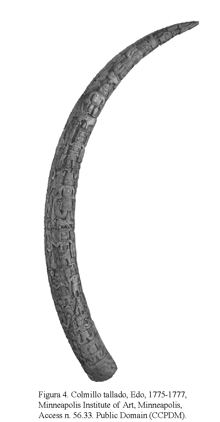 Había en Benín un gremio de talladores de marfil y madera, los Igbesanmwan, que se encontraba bajo supervisión real. Su legitimidad se construía en parte sobre el mito de que el grupo había sido fundado por el primer rey de Benín, mucho antes de que apareciera su equivalente de artesanos del metal (Iguneronmwon).[16] Contamos con un testimonio explícito de 1651 que registra el uso de colmillos tallados en los altares en homenaje de los ancestros.[17] En el palacio real, cada Oba debía encargar al menos uno de esos colmillos en honor a su padre en el curso de los tres primeros años de su reinado (figura 4). El marfil era fundamental en las ceremonias reales, simbolizaba la corte ancestral de Olokun, dios de la abundancia, la fertilidad y el mar.[18] Los altares permitían, entonces, reconstruir la genealogía del rey y articularla con la divinidad. A comienzos del siglo xix, un europeo registró que en uno solo de los altares reales había sesenta colmillos tallados.[19] La producción para uso local se extendió al menos hasta fines del Ochocientos.