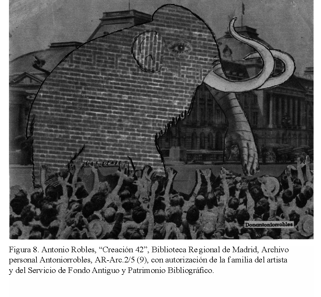 Sin embargo, el apólogo de los ciegos fue conocido y citado en Occidente de formas que revelan tensiones persistentes en nuestra concepción de las relaciones entre lo humano y lo animal. Fue tan popular que, en 1872, John Godfrey Saxe le dedicó un poema y, durante el siglo xx, un chiste breve hizo que fueran los elefantes quienes tocaban a un hombre con la trompa para intentar determinar sus características. Esta inversión irónica sugiere tanto la persistencia como la maleabilidad de los símbolos que articulan humanidad y animalidad. En tiempos de circulación cultural acelerada, el escritor español Antonio Robles también se apropió jocosamente del tema en un collage que sintetiza los motivos que hemos explorado: un elefante cuya trompa fue sustituida por un brazo y una mano humanas, junto a media docena de personas que intentan tocarlo (figura 8). El juego sobre los límites del conocimiento, sobre el hecho de que no observamos el mundo sino el mundo expuesto a nuestros métodos de percepción, se completa con el ojo del elefante, que también ha sido reemplazado por uno humano.